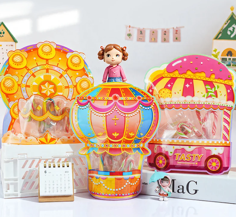 La base autoportante permite una presentación estable y atractiva, mejorando la visibilidad del producto y favoreciendo la decisión de compra por impulso. Además, su diseño temático las hace especialmente atractivas para el público infantil y para marcas que buscan un empaque memorable.